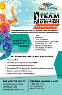 I am reaching out to share with you some great news about the work of SASHA Center and to let you know that we have trainers who are available to spend time with your players, staff and any vendors at the team level to teach/discuss and learn about sexual assault, decision making, dating and domestic violence, healthy manhood, gender equality, diversity and relationship management and safety.